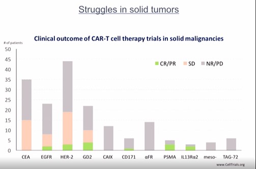 2017年以來,美國食品藥品監(jiān)督管理局接連批準(zhǔn)諾華公司的Kymriah 和 Kite 制 藥 的 Yescarta上市,使CAR-T 療法開始出現(xiàn)在大眾視野,并逐漸成為最具前景的腫瘤治療方式之一。近年 CAR-T在血液系統(tǒng)腫瘤治療,尤其是靶向CD19 CAR-T在急性難治型淋巴細(xì)胞白血病治療中,取得了矚目成就。然而,CAR-T在實(shí)體瘤的攻堅(jiān)上仍處于一個(gè)初期階段。按照雷博士的話說,為數(shù)不多的靶點(diǎn),腫瘤微環(huán)境、腫瘤異質(zhì)性、On Target Off-tumor所導(dǎo)致的副作用都是限制CAR-T療法在實(shí)體瘤領(lǐng)域發(fā)揮的重要因素。